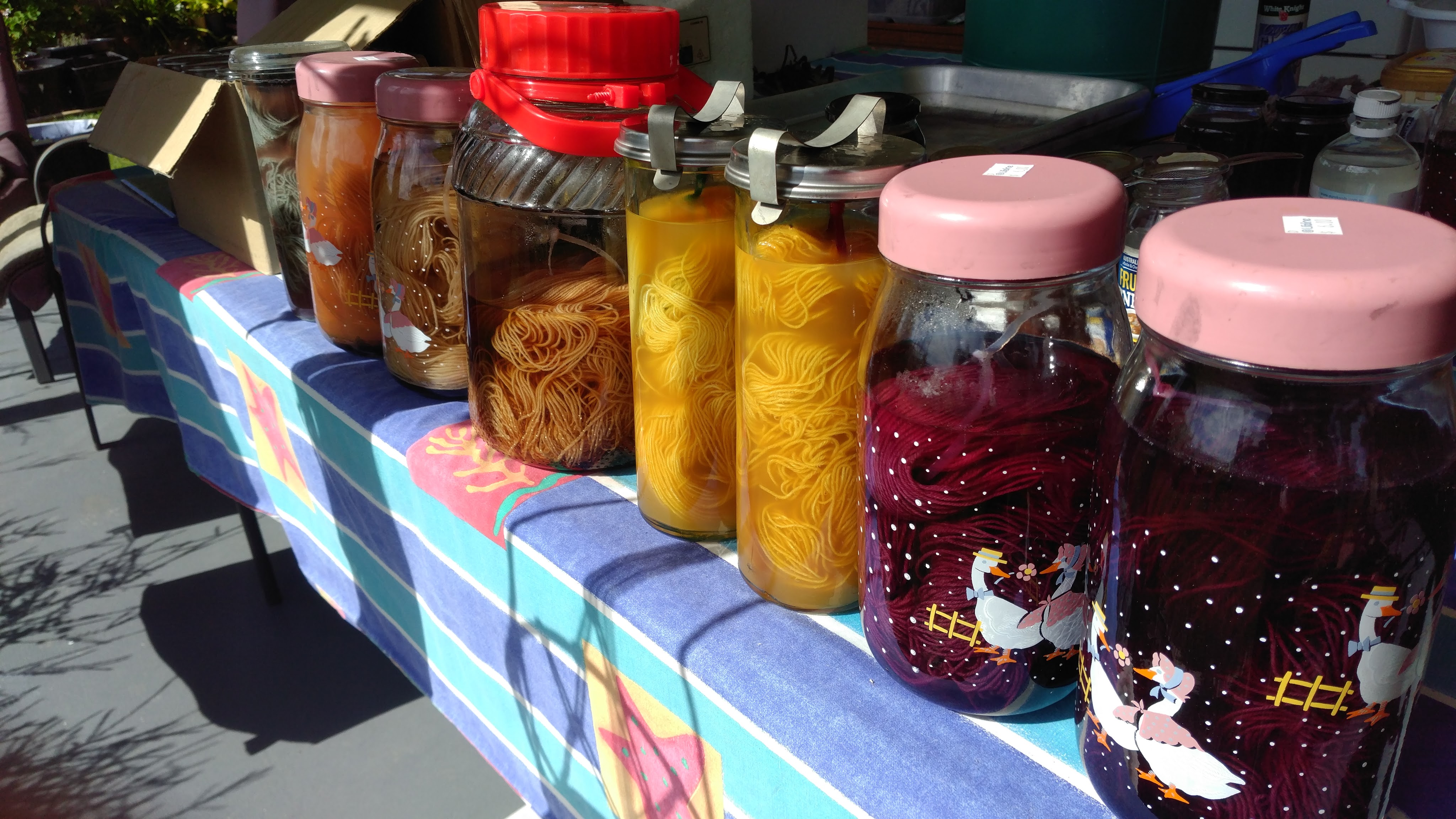 I’m going to have a stall at KnitFest in Maleny this year and I’m so excited to share some of the projects I’m preparing to showcase. This is my solar dyeing space, and I love the colours I’m getting. There are flower dyes, lichens dyes and even tea dyes, and it’s been frustrating waiting to see the finish colours on the yarn. This is just a fraction of what I’ve got planned, so watch this space for another update coming soon…